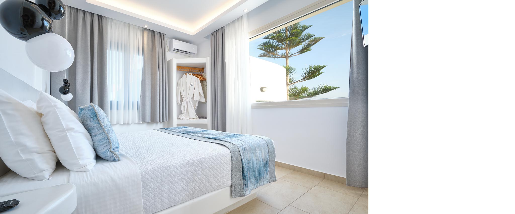 Located on the first floor, it offers an exquisite private veranda (485 sq.ft / 47m2) with a hydromassage, where you can admire stunning views of the Aegean Sea. If the weather permits, Mykonos, Delos, and Rineia can all be seen; even Paros.
