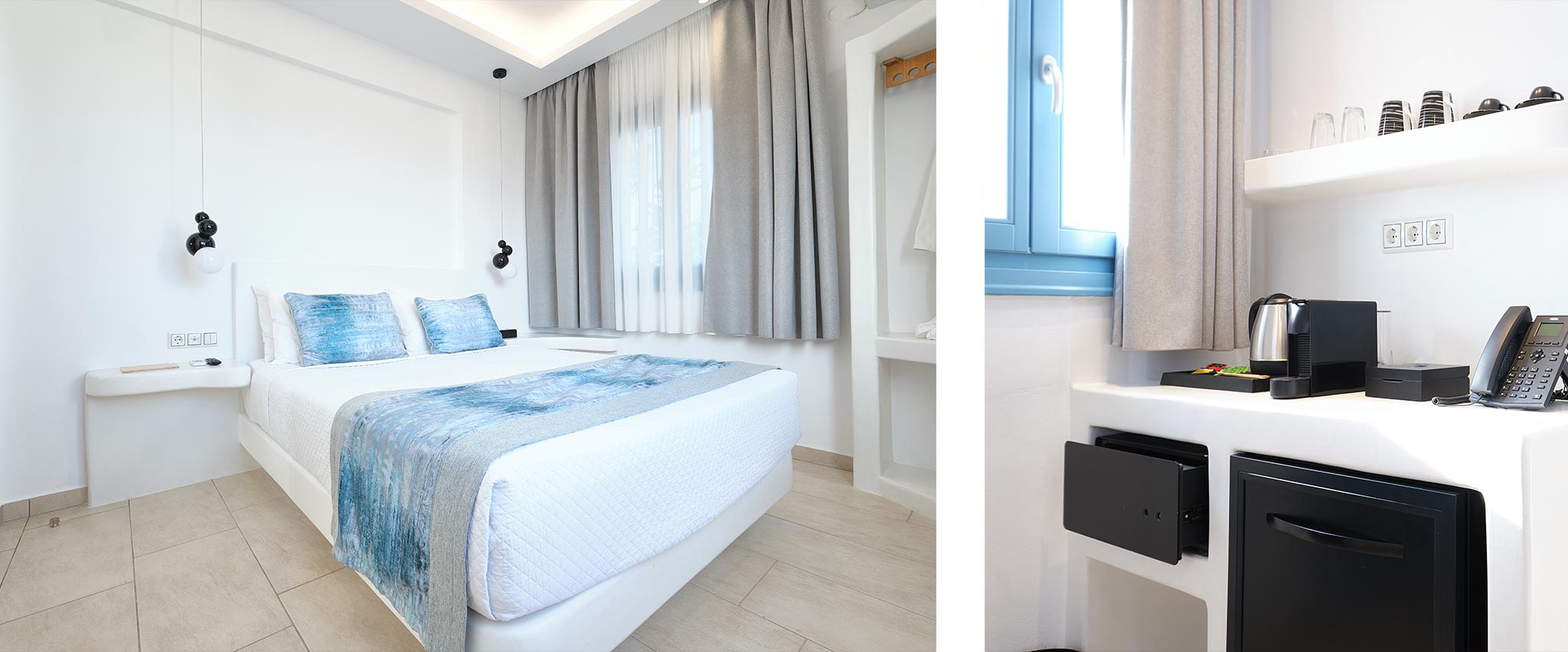 Each one consists of one bedroom, a separate living room with kitchenette and dining space, and fantastic views to the Aegean sea.