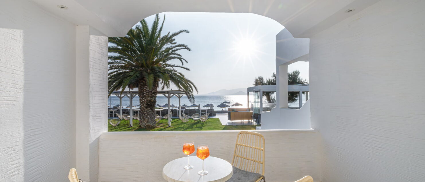Located on the first floor, it offers an exquisite private veranda (485 sq.ft / 47m2) with a hydromassage, where you can admire stunning views of the Aegean Sea. If the weather permits, Mykonos, Delos, and Rineia can all be seen; even Paros.
