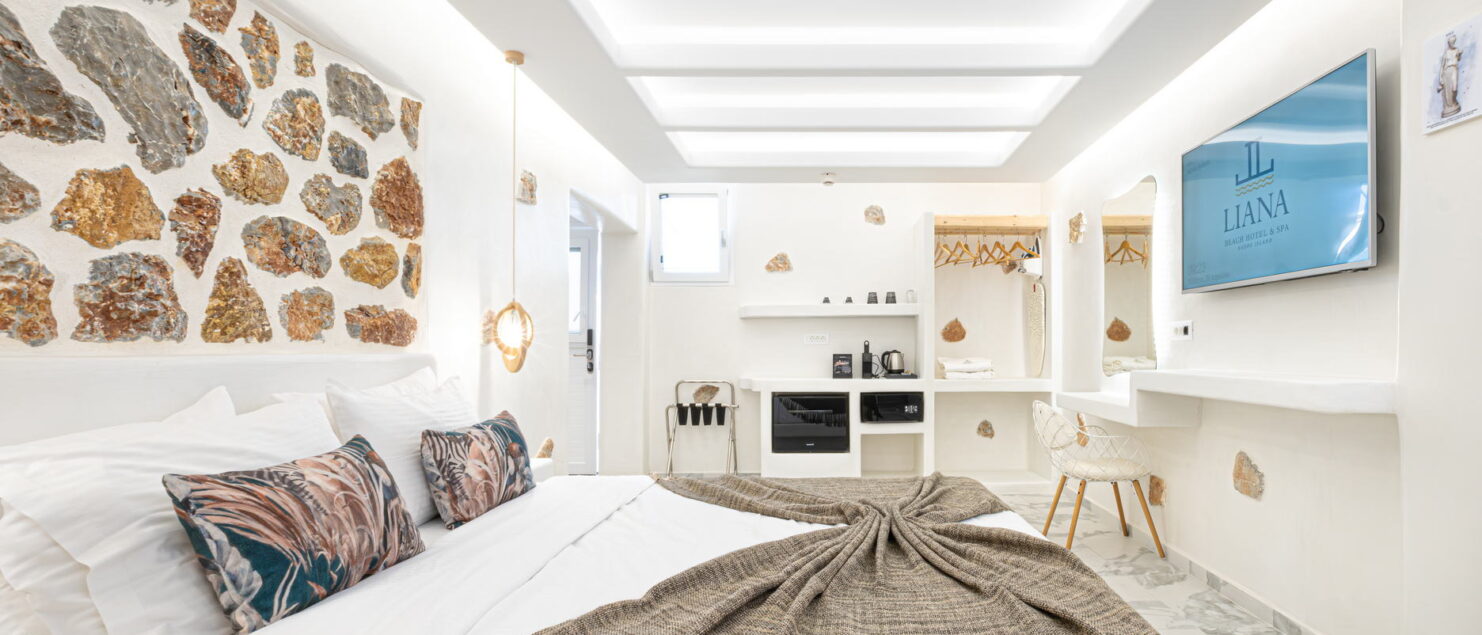 The Elite suites feature a king-size bed (180x200cm), super comfortable Coco-Mat mattresses, premium linens, a luxurious bathroom with walk-in shower, plus an additional WC.