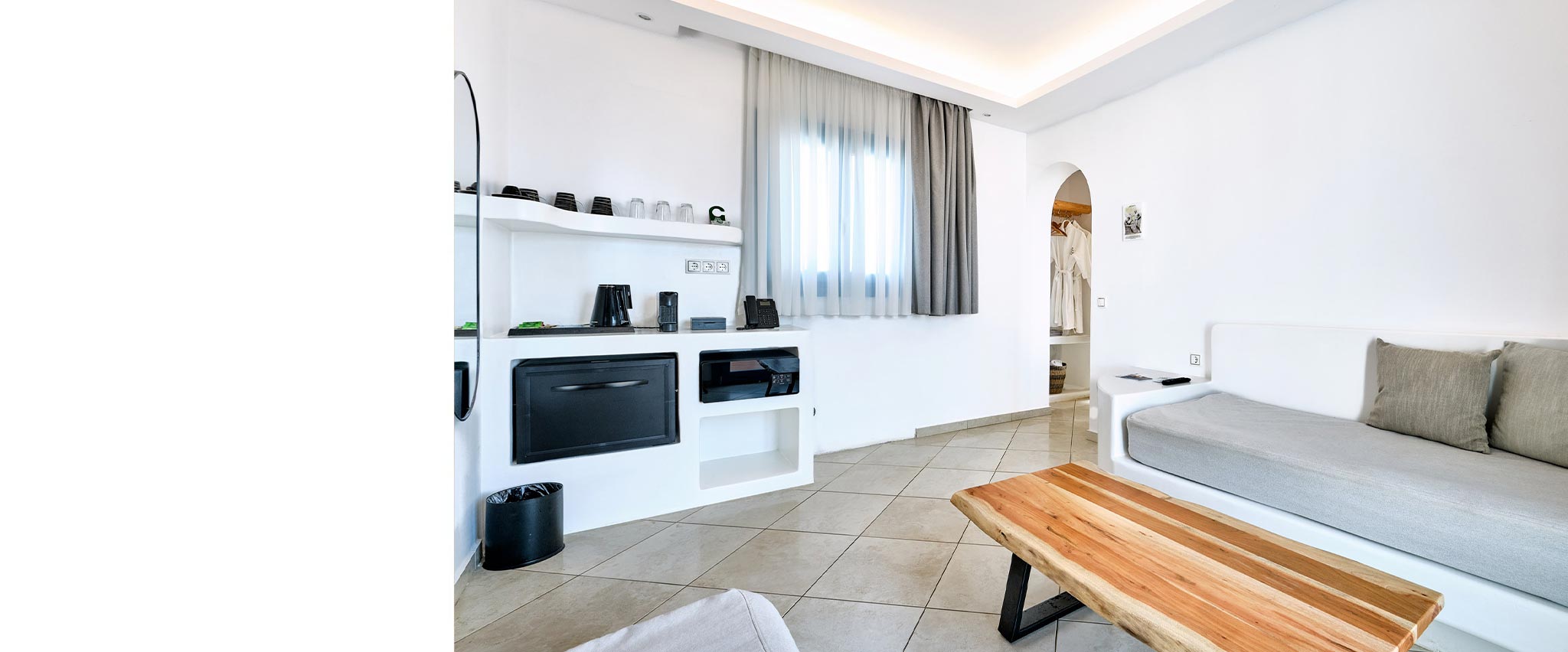 Moreover, the suite features a separate living room with a kitchenette and dining area. From this room, you can also enjoy the splendid views of the Aegean Sea for a few moments of tranquility.